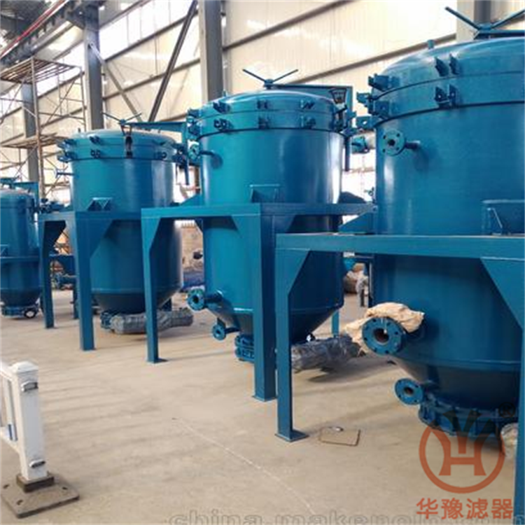 過濾泵將待濾液經進液管泵入罐內,并充滿,在壓力的作用下,濾液中的固體雜質被濾液上的濾網截留,并在濾網上形成濾餅,濾液透過濾網經濾咀進入出液管流出罐體,從而得到清晰的濾液。